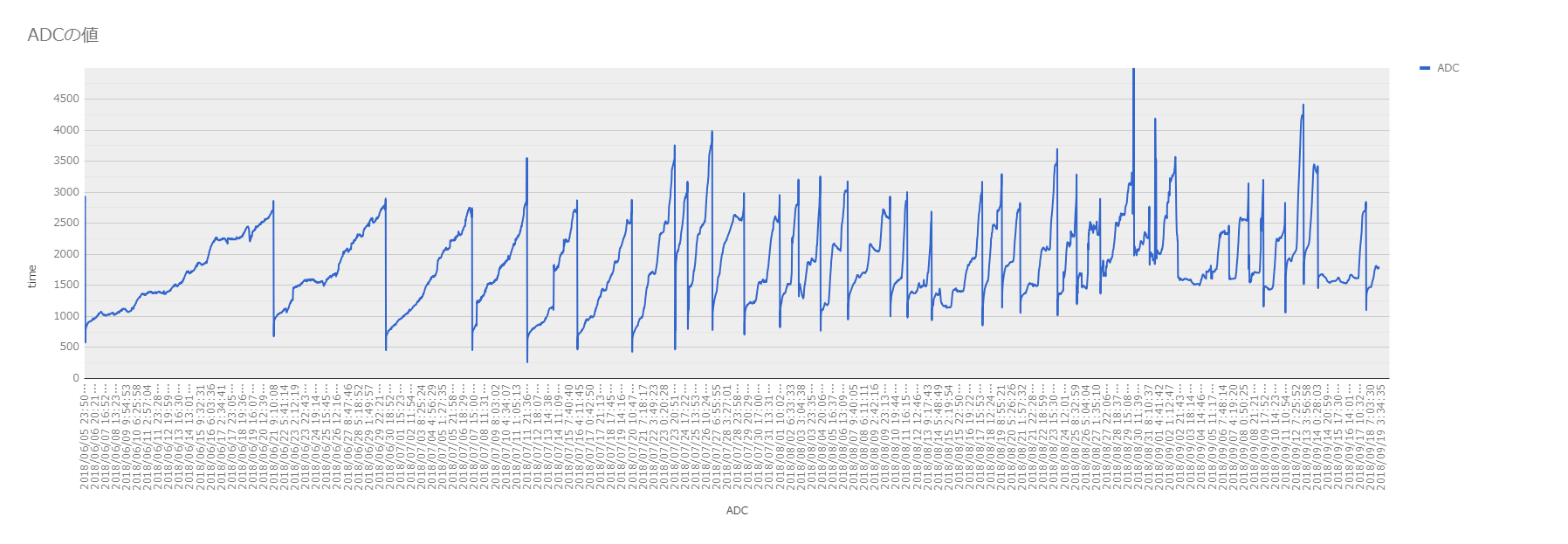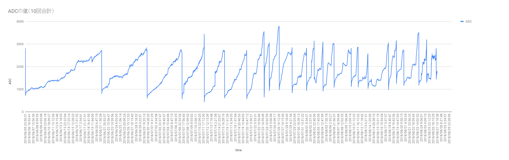 ADC 読むのは、最初を4回捨てて、10回平均を取る、ぐらいが安定する感じだった